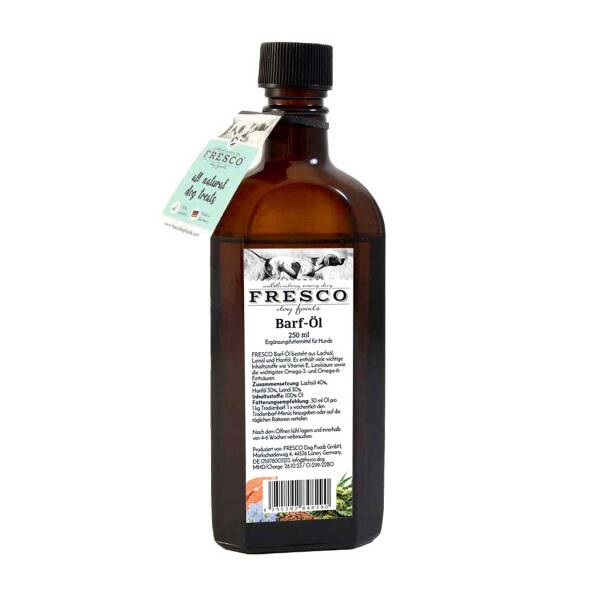 Durch die Zugabe von FRESCO Trockenbarf Öl, bestehend aus Leinöl, Lachsöl, Distelöl, Dorsch-Lebertran und Weizenkeimöl, werden die Trockenbarf Complete-Menüs zum Alleinfutter.